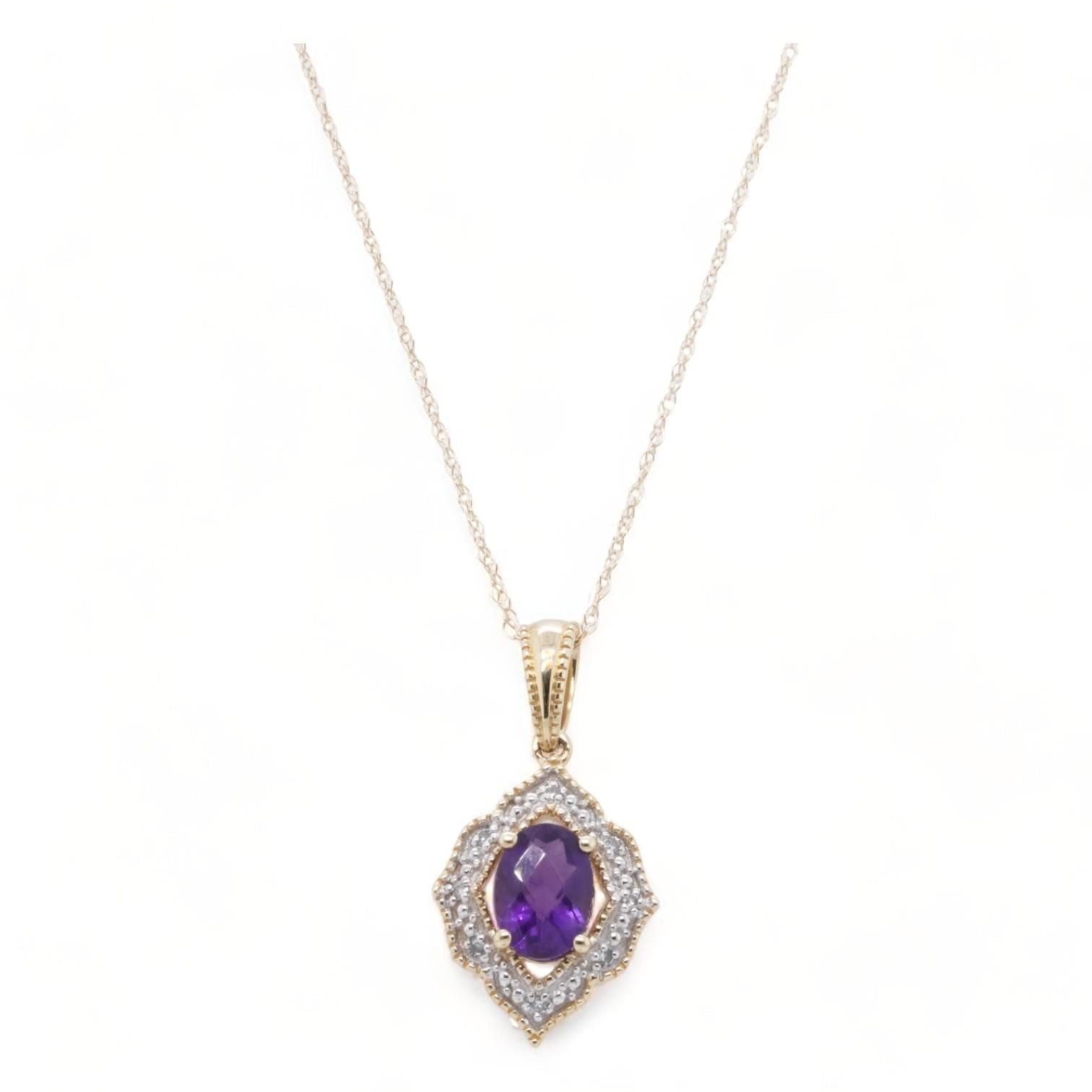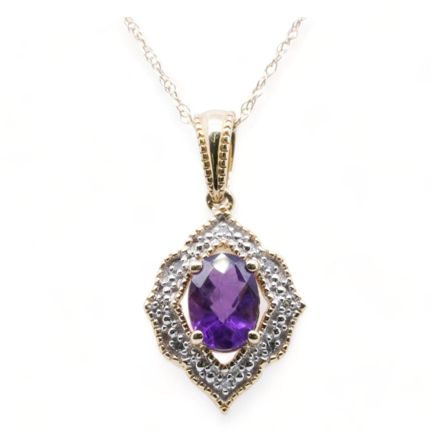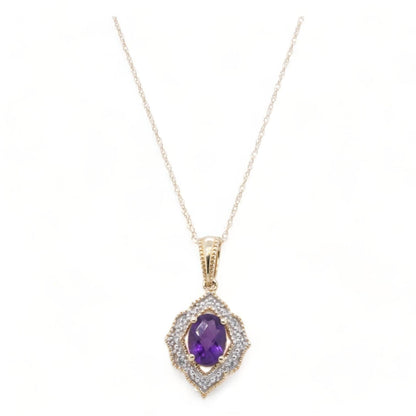10K Gold Oval Amethyst With Diamond Halo Pendant Necklace