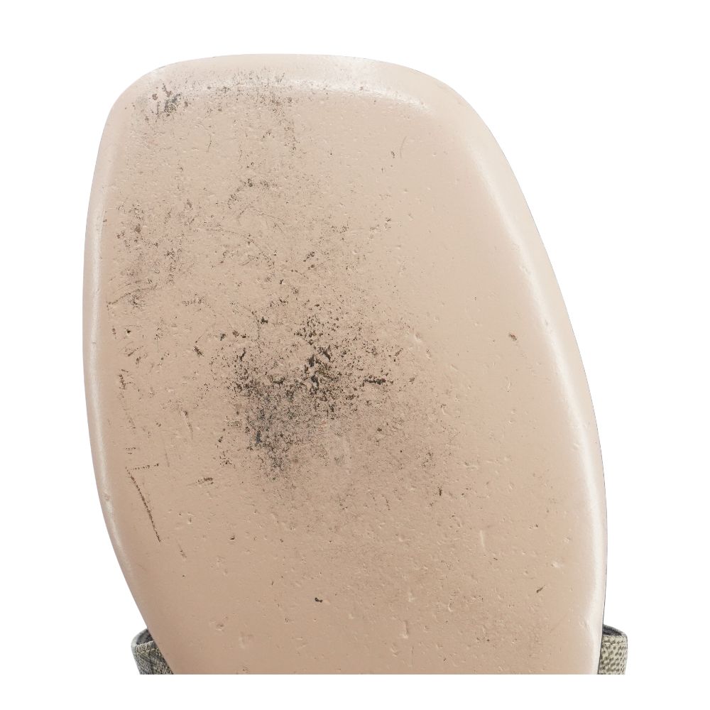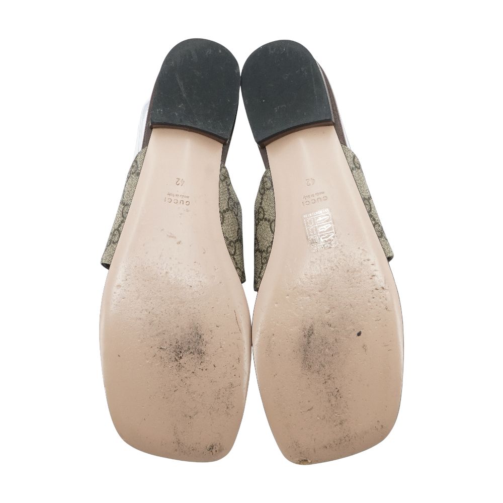 The Gucci Beige & Ebony Blondie Thong Sandal features the house’s classic GG canvas paired with sleek leather accents and the signature Blondie emblem for a timeless, recognizable look. This pair shows wear to the soles and noticeable use on the footbeds, consistent with regular wear. Light leather wear is also present along the straps and trim. Overall, the sandals retain their chic, understated style while showing gentle signs of use.