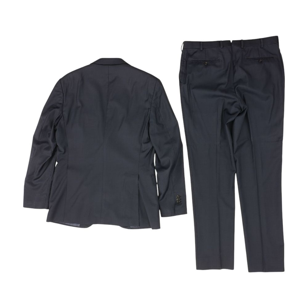 The SuitSupply Navy Solid Pure Wool Super 110's Napoli International 2-Piece Suit is a refined, slim-fit ensemble crafted from 100% Super 110's wool sourced from Italy's renowned Vitale Barberis Canonico mill. This suit features a two-button, single-breasted jacket with a notch lapel, dual rear vents, and a fully lined interior, complemented by flat-front trousers with a clean finish. Designed for versatility, its classic navy hue and contemporary cut make it suitable for both professional and formal occasions.